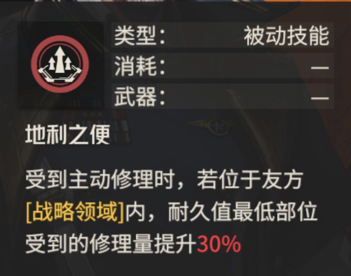 地利之便:此技能可以算是凑数技能,提高受主动维修的治疗量,但是只对耐久最低部位生效,效果甚微,并且需要依赖友方战略领域。完全没必要携带