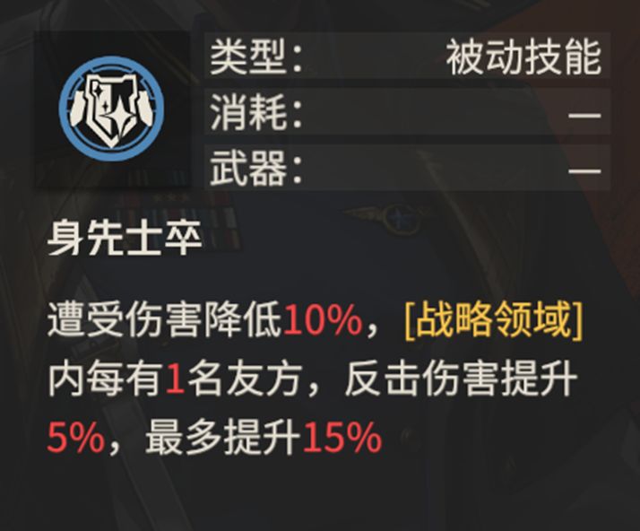 身先士卒:非常强力的减伤技能。不难发现,其余两个S守护者类似的减伤效果都是需要通过耐久值降低来换取,而此技能,无需任何其他条件,即可常驻10%的减伤,这一点便足以让他羡煞旁人。