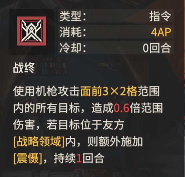 战终:范围控制技能,伤害不高,但是对战略领域中的敌人使用,能够造成震慑效果,使敌人无法移动。
