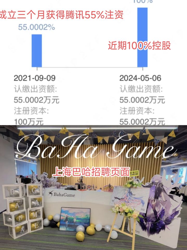 企查查近日显示,广西腾讯创业投资有限公司(腾讯旗下投资公司)对上海巴哈(Baha Game)实现了100%控股,原股东悉数退出。上海巴哈成立于2021年6月23日,三个月便获得腾讯注资,腾讯持股高达55%。