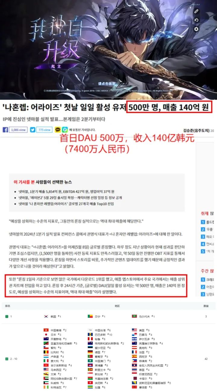 综合来看,《我独自升级:起立》海外首发成绩直追2020年的《原神》和2023年的《星穹铁道》,成为了今年全球范围内的现象级新游,也成为了韩国游戏厂商有史以来全球市场首发成绩最好的二次元游戏。在中国公司二次元新游戏《鸣潮》《绝区零》今年发布之前,韩国人抢了个先手棋。#今天游戏圈发生了啥
