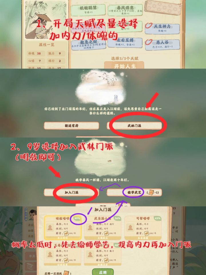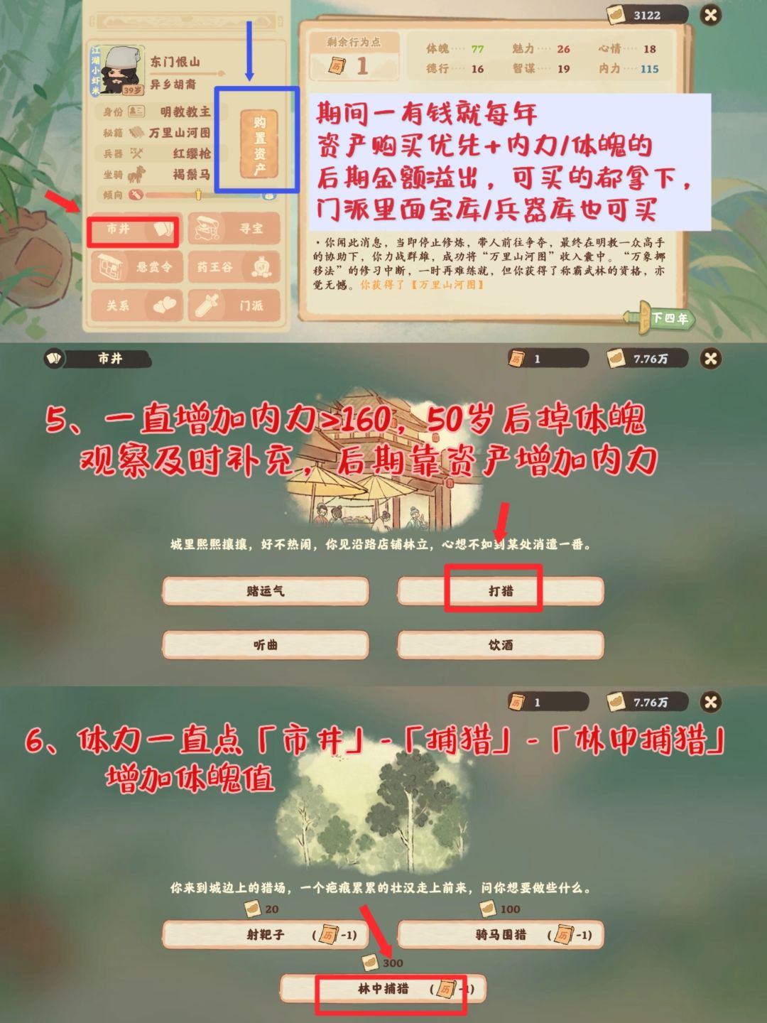 (增加体魄期间一有钱就每年资产购买优先+内力/体魄的,后期金额溢出,可买的都拿下,门派里面宝库/兵器库也可买。)