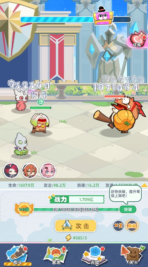 点击【攻击】我们的角色将会主动对敌人进行一次攻击~随着等级的提升我们可以选择【x2】高倍速战斗,以及【自动】战斗功能哦~让战斗又快又方便。