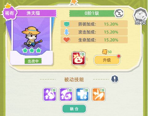 这里瑾瑜酱的协战伙伴是渔夫猫,因为瑾瑜爱钓鱼,钓鱼佬从不空军!从上面的信息来看猫猫是紫色品质的伙伴,并且有金色的被动技能(瑾瑜是不是很欧哼哼),招募重复的伙伴时可以点击【融合】按钮为伙伴进行【升星】,升星后可以提供新的被动技能或者强化已有的被动技能。