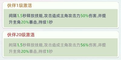 以钓鱼猫为例,猫猫会间隔1.5秒释放技能,攻击造成主角攻击力50%伤害,并提升主角20%暴击持续1秒。主动技能的倍率也会随着伙伴等级的增加而增加。伙伴通过吸收冒险饼干提升等级,冒险饼干可在游戏内各大玩法中获得哦~