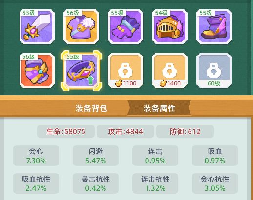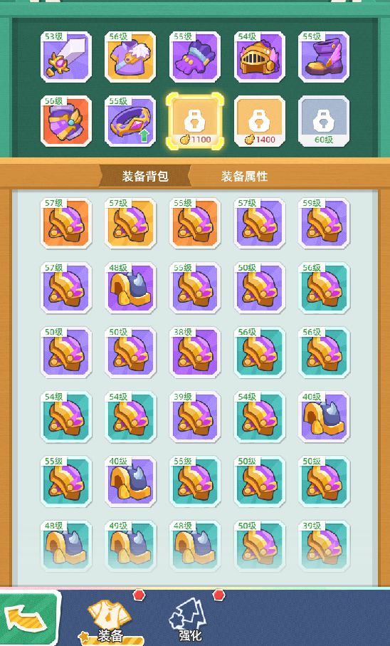 在装备界面上方显示的是我们当前角色所穿戴的装备,角色初始有5个装备槽,随着等级的增长小伙伴们可以使用金菠萝来解锁更多装备槽以获取更高的角色属性。