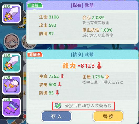 在介绍装备板块之前我们要先了解在冒险中获得或替换的装备都去哪了?在冒险中战力高的装备将会替换当前战力较低的装备,替换后原先的装备将会存入背包,战力较低的装备也会自动存入背包,在自动战斗中不被提醒。