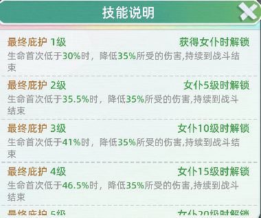 每位女仆都会有一个女仆技能,瑾瑜的技能是当小伙伴的生命首次低于30%时,降低35%所受的伤害,持续到战斗结束,人家是不会让魔物轻易伤害小伙伴们的。