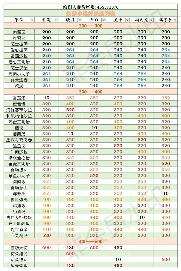 筑梦小巢菜品好感度列表(更新中)