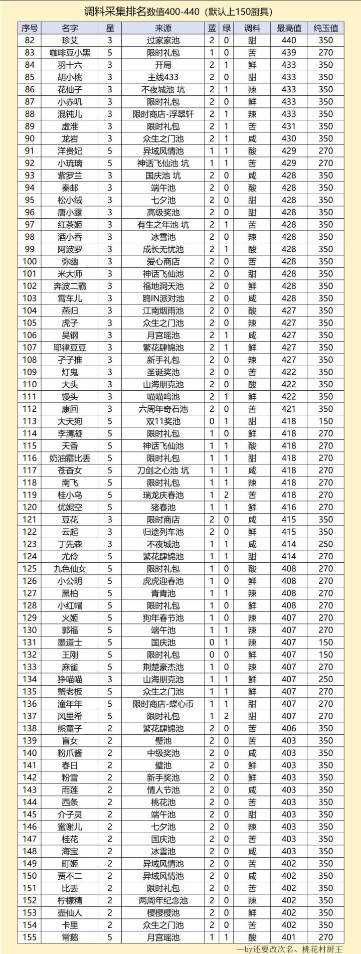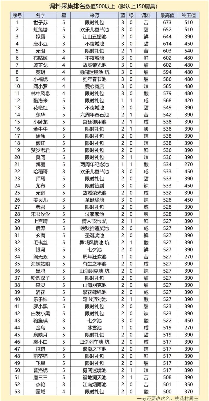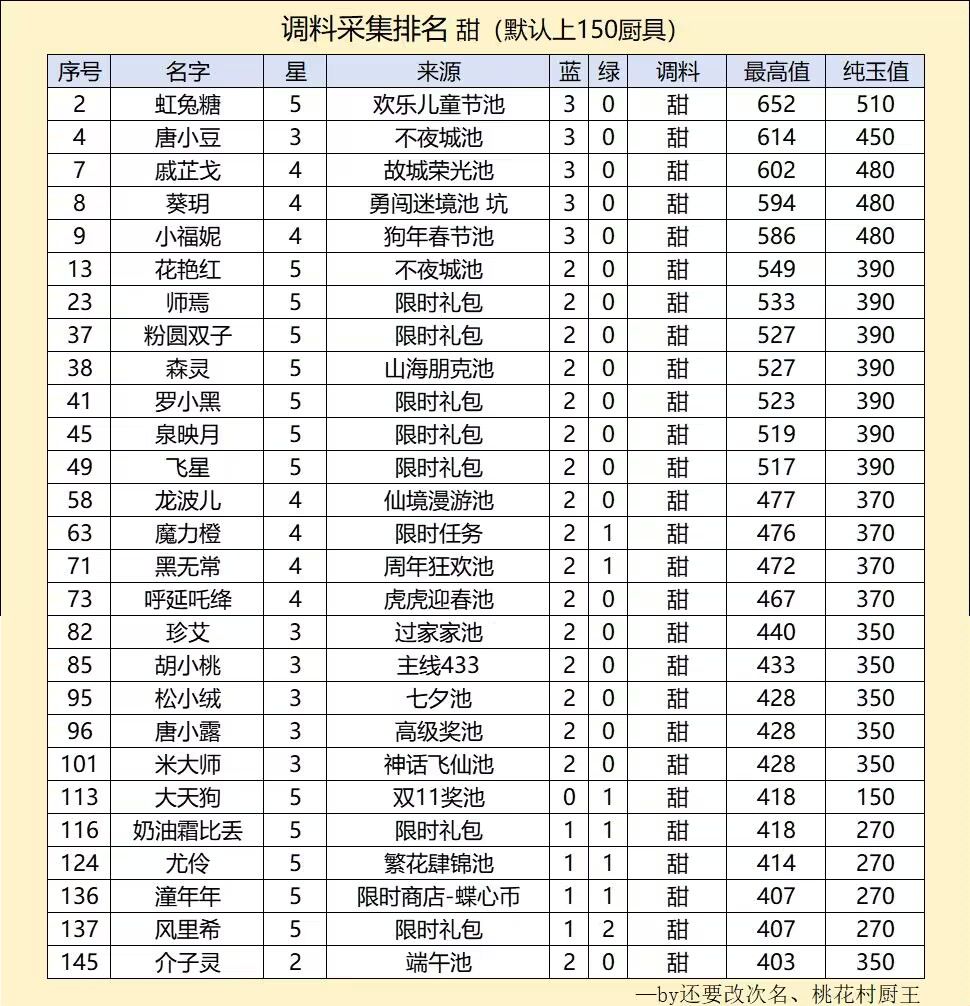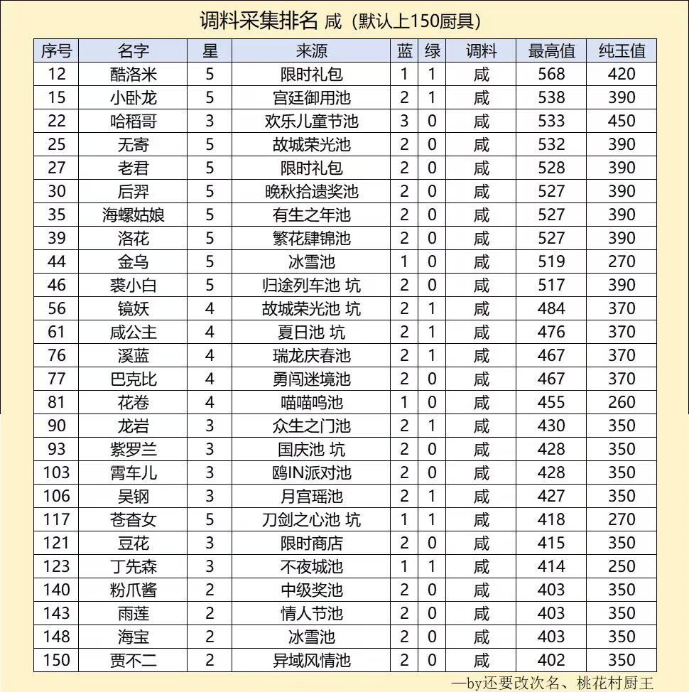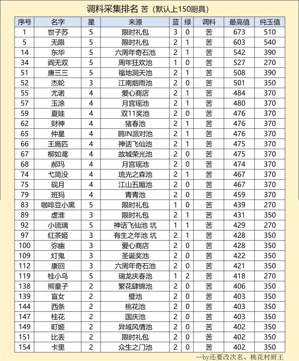 另外,纯玉值那一列,这列是不考虑自身带的酸甜苦辣,直接上其他调料玉和150厨具,至于怎么用,大家自行发挥了。