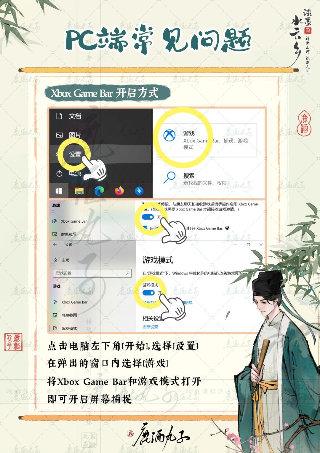 🌸点击电脑左下角[开始],选择[设置],点击电脑左下角[开始],选择[设置],将Xbox Game Bar和游戏模式打开,即可开启屏幕捕捉