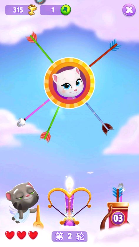 其实小宠物每天都是有很多小心愿的,而我们满足了它的心愿,就可以获得一定数量的飞行币。有时候我们可能不清楚宠物表达的具体意思,那么可以直接点它头上移步到相关场所就好啦。那么这次宠物想看汤姆猫去射箭,点击头上就能进入到小游戏的环节。这个游戏类似于见缝插针,只要不触碰到轮盘上的箭就可以不断获取飞行币哦。