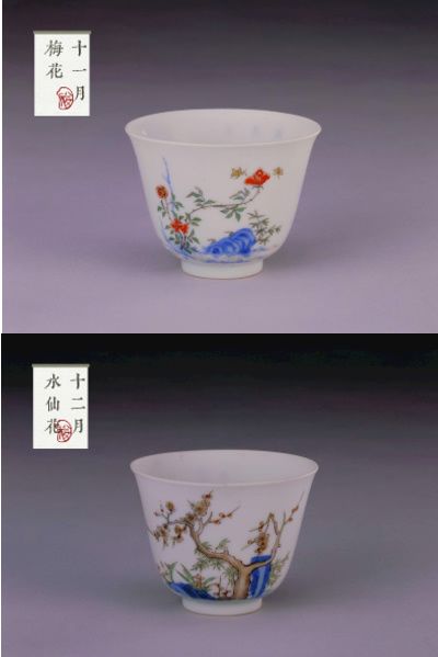 外壁一面以青花五彩装饰,描绘代表12 个月中某个月的花卉,另一面题写与花卉相对应的诗句。分别为:
