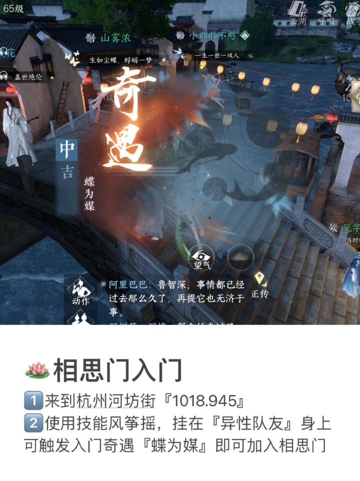 2⃣️使用技能风筝摇,挂在『异性队友』身上可触发入门奇遇『蝶为媒』即可加入相思门