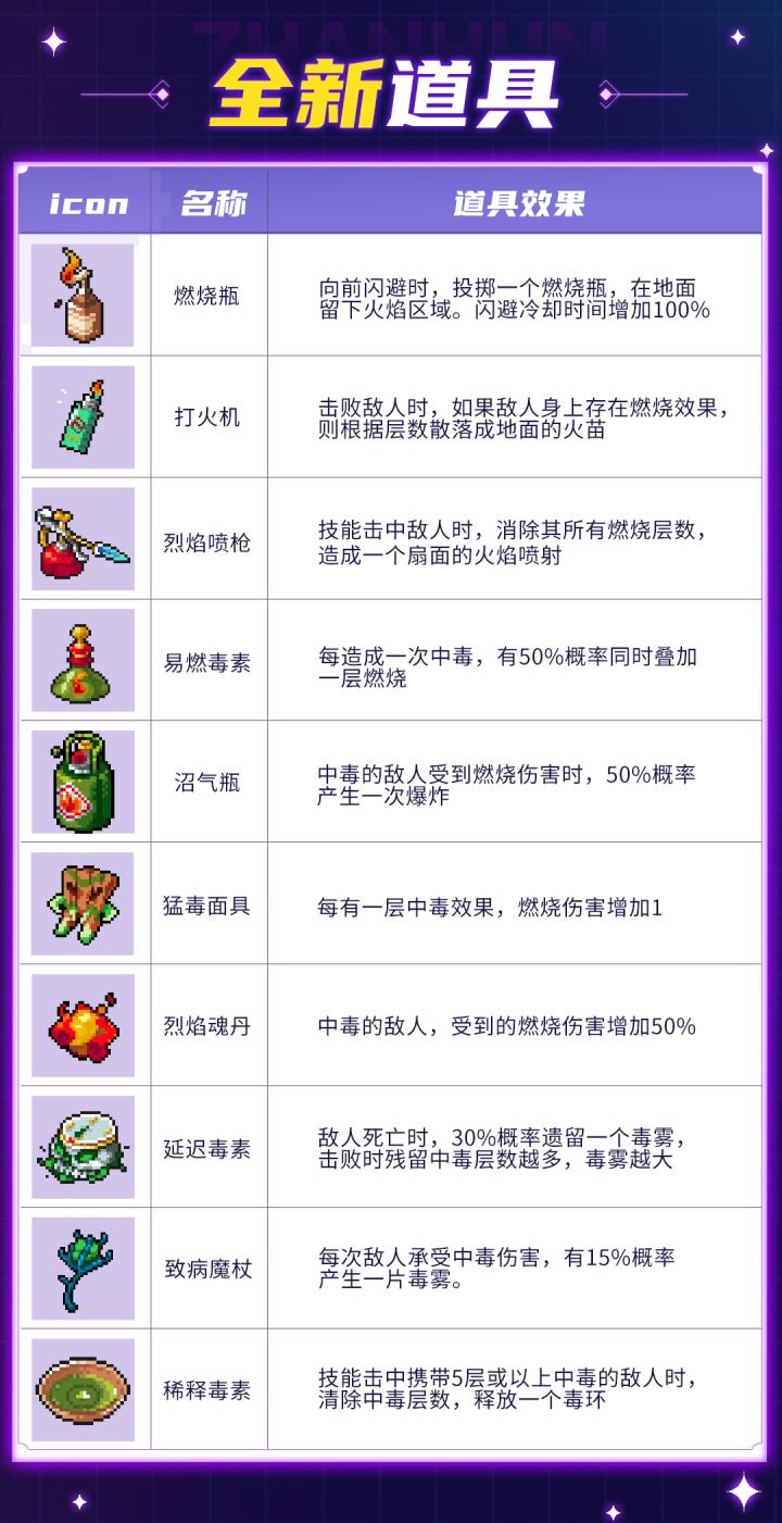 最后再次吐槽一下新的毒火道具,猛毒面具和烈焰魂丹吧虽然是能提高燃烧伤害,但是你光看名字压根不知道它的效果居然是和燃烧或者中毒有关联的,不如把猛毒面具的效果改成中毒触发频率变高,烈焰魂丹的效果改成在满层燃烧状态下死亡的敌人能够给自己提供燃烧伤害加成。(这只是我的一些脑洞,有太多想法讲不完只能说几个),最主要的问题是为什么要做这么多绑定毒火的道具,而不是单独强化中毒和燃烧的道具,有那么两三个就可以了的感觉(易燃毒素和沼气瓶还可以)。