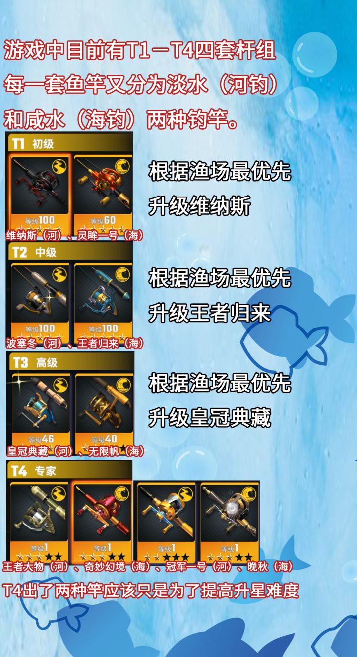 正确的资源分配方法应该是前期只升送的紫竿【光轮3000】30级以下过渡,不用升太高等级,低级紫竿也已经足够应付绝大部分鱼了。然后坐等一个活动奖励的金箱子或者商城刷新出的4折金箱。官方送的兑换码兑换完是够一个4折金箱的,而且锦标赛冲分到后面阶段奖励也有200钻石,所以不用太焦虑。18级以前不要把金箱子全部开完,以攒为主,因为前期的金竿星级不用太高就够用,能省则省,后面肯定会不断推出新的等级,需要升到更高等级去开,金箱的奖励池原理是随着玩家等级变化,玩家等级高了会解锁新的钓竿,所以金色宝箱越后面开越好;你17级没开T2图,开金色宝箱就只能开T1的金色鱼竿,而30级已经开到了T3图,可以开出T1/T2/T3的金色鱼竿。所以后面可以给前面的金竿补课升星,一次性完美解决所有问题!