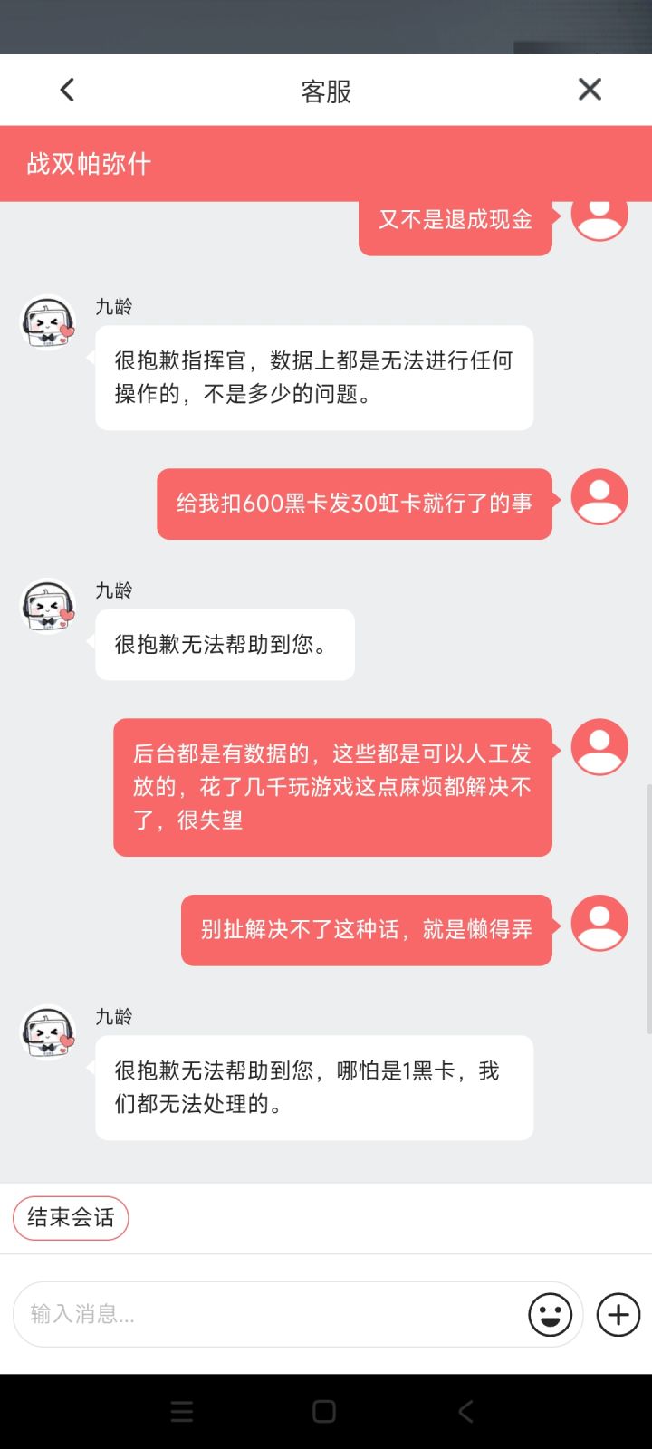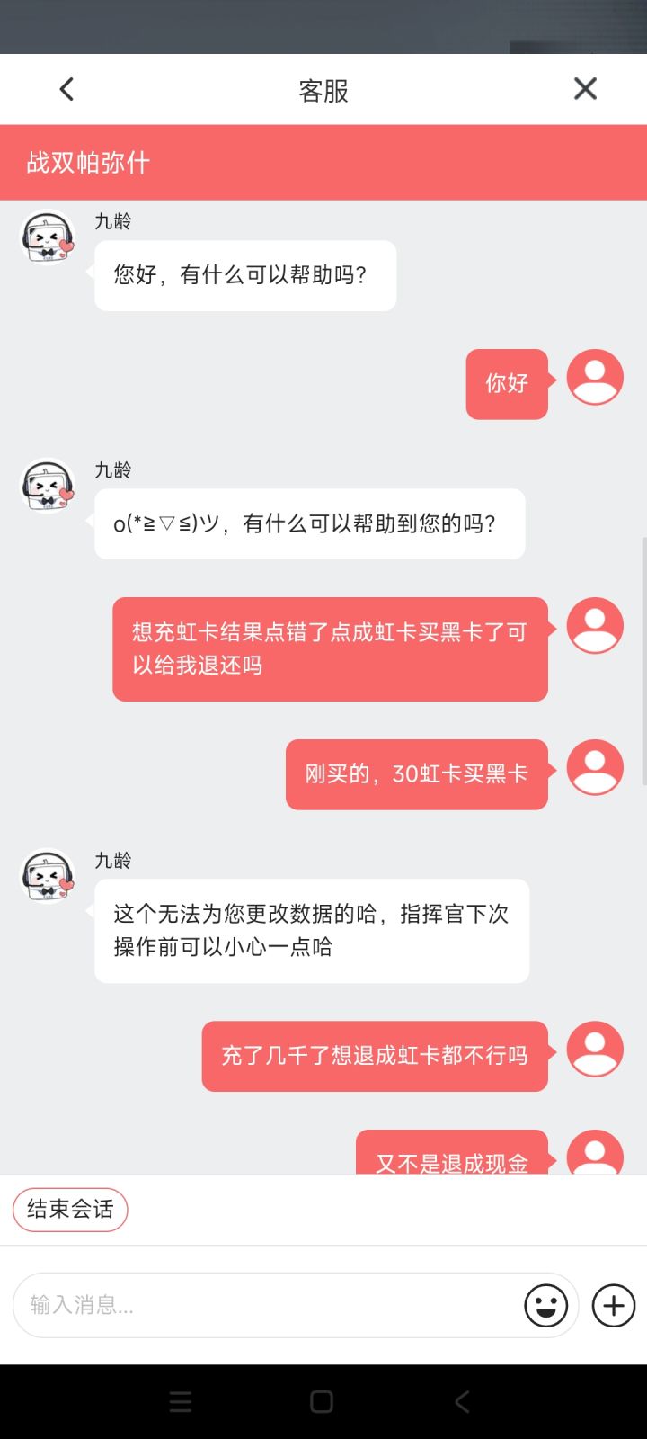 今天准备买个皮肤,没有168的档位,充了128发现不够(当时看了一眼皮肤价格再退回充值界面),结果点错了点到虹卡换黑卡界面了,手又快直接点了兑换黑卡,确认也不让我确认,直接成功了,平时充钱都是买大小月卡或者礼包,买黑卡亏的要命,找客服误操作想退成虹卡,不给退,挺失望的,玩两年了也氪了大几千,30块钱小事,主要感觉这挺简单的东西就是不给我弄,买的时候也不给个确认的窗口,这操作真就这么复杂?刚开服的时候每个人发一万黑卡不也都退回去了,有没有懂的说说