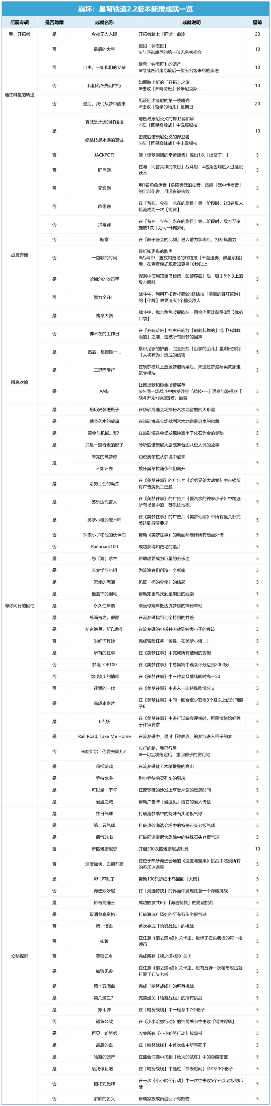 亲爱的开拓者们大家好!2.2版本新增成就的达成攻略一览表来啦!完成所有成就后共可获得420星琼,“肝有余力”的开拓者们千万不要错过了!