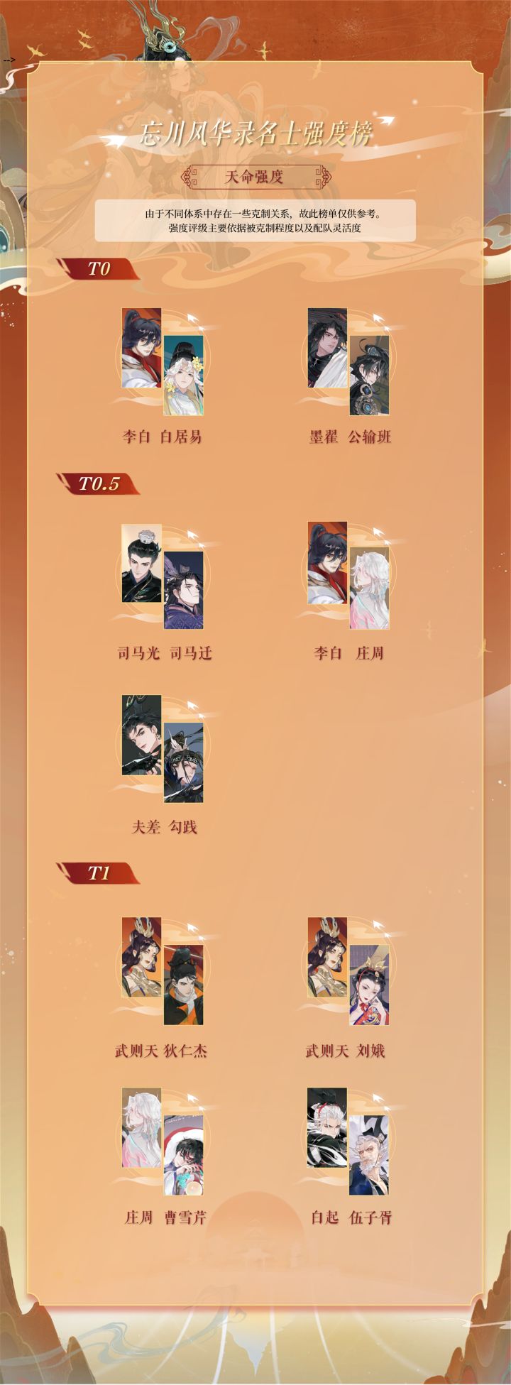正常发育不到一个月应该能达到李白白居易双六星(李白6白居易5亦可),剩下的资源就可以考虑攒着拉一下新卡(据说是刘秀,下个月出阴丽华),剩下一个位置根据自己的抽卡情况补充,一般新区的话这个位置平民上大周后即可,前期无脑强。最后组成李白白居易,新天命,大周后的体系。