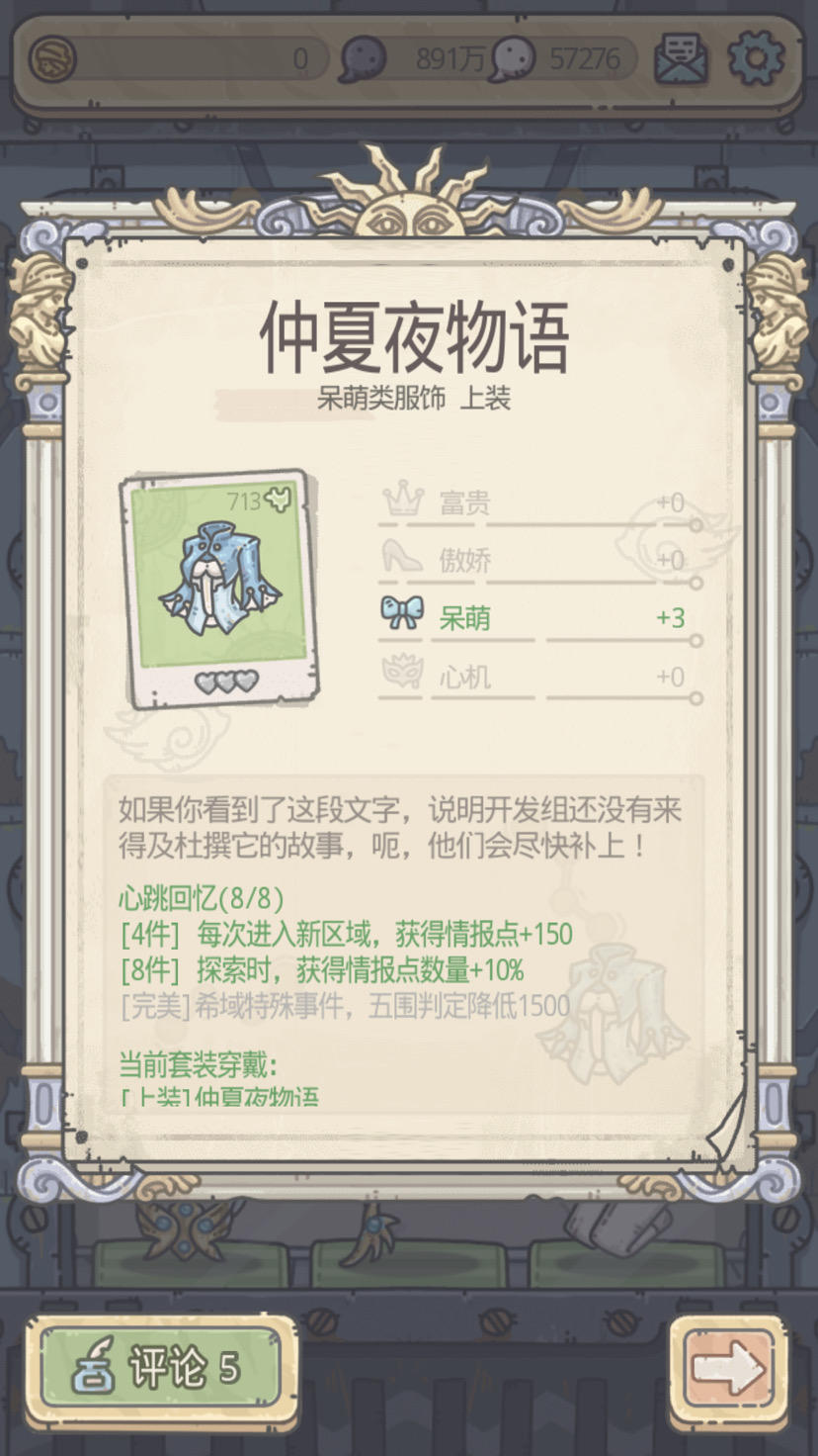 下周正式服就开放了,虽然我正式服依然被卡圣女,不过希域小建议,雅典娜一开始穿这个绿色的套装赚情报点比较好,因为使徒攻击力实在是太高了,开倒数第二个图的使徒攻击力达到了11w,在特殊玩法没出没有属性加成前很难打过,图开的少情报点少,这个套装就挺有用的了。