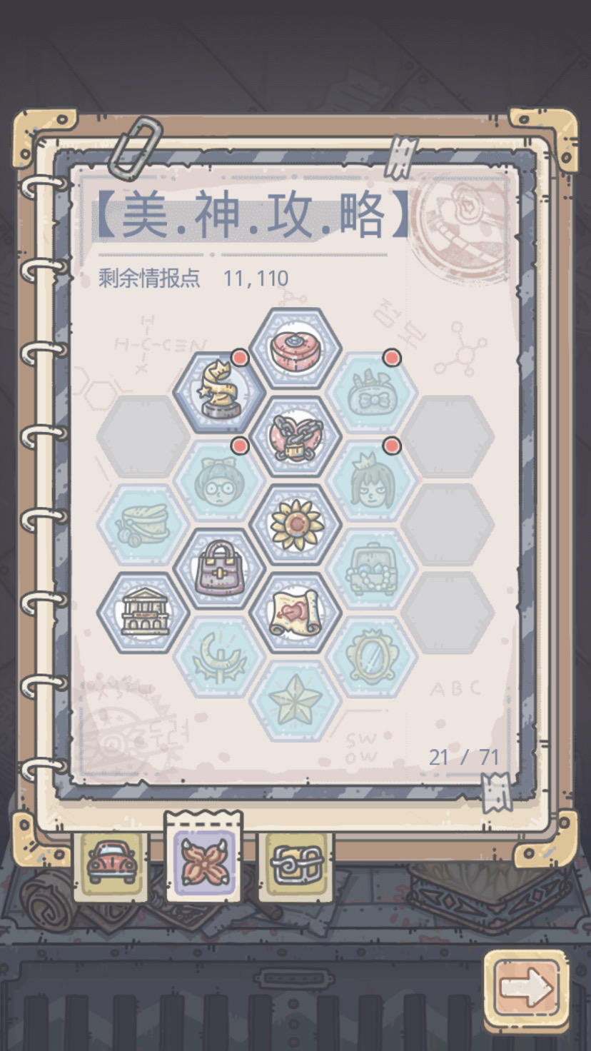 第一个情报图左下角点满的为探索装备,和埃罗一样,探索装分两部分,第一部分卡片兑换合成紫色,重要线索获得紫色,两个合成一个橙,其次就是这个情报点3级获得3个紫合成橙色,两个橙合成红色。重要线索和情报点装备都需要开到倒数第二个图,个人觉得难度有点大。