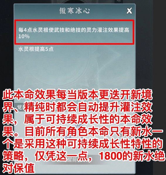 这就意味着每当版本更迭开放新境界、精纯、或六命以上时,新水灵力灌注效果会随境界增加、精纯提升、本命开放等因素加持获得成长,仅凭这一点,新水强度妥妥的t0