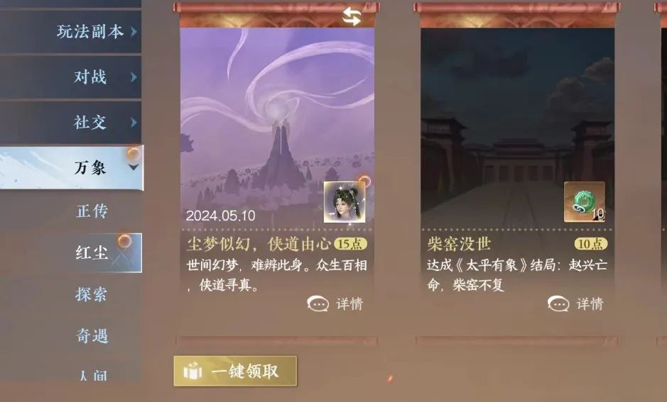 3、完成华章任务《芳心有梦》:5月3日已经开放了,奖励可以获得【发饰·寻芳语蝶】、【素心济尘·进阶】。
