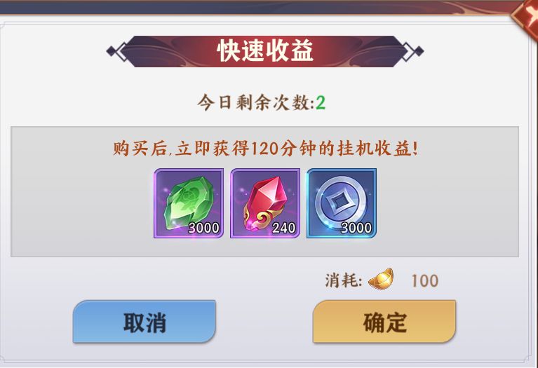 玩法内附加内容:快速受益,玩家可直接消耗元宝获取120分钟的挂机资源奖励,一天只有3次快速收益的机会,PS:建议每天养成后,达到玩法的极限关卡后再使用快速收益,有利于收益最大化
