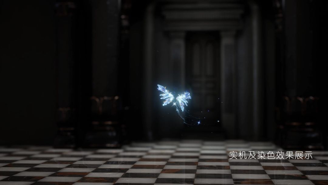 【技术呈现】发型多达5处染色区,可以充分发挥奇思妙想。全新技术呈现刘海发丝处宛如星河流动般的幻彩流光效果,与发饰、耳环、项链、手持、戒指产生的海浪涌动和动态光效交相呼应,主题性更强。腰部重金属风格的腰封、与鎏金蝶翅装饰,叠加在内裙银河环绕的特效之上。罩纱采取蝴蝶翅膀的纹理,与环绕的小翅膀同频流光,不同角度折射出不同的幻彩效果。
