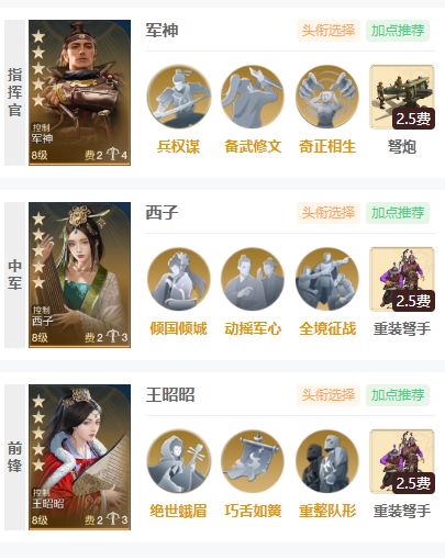 王昭昭自带技能绝世峨眉,能够让敌方在攻击女性武将的时候陷入混乱,而中军和前锋又是敌方攻击的主要目标,所以西子作为女性英雄也是能够和王昭昭打出配合效果。王昭昭带上巧舌如簧,能够使敌方强行攻击自己,触发绝世峨眉的混乱效果,重整队形则是提供一定的恢复能力。