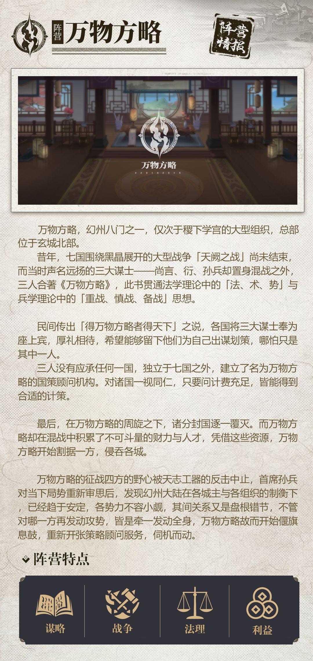 »»《启明幻歌》中有八大阵营设定,分别为「天志工器」、「万物方略」、「稷下学宫」、「东泽贤市」、「百事楼」、「公输制造」、「陶朱商会」和「神州玄术」««