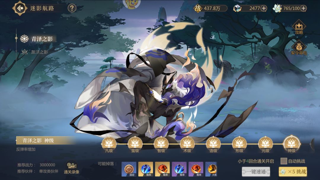 4、玩法介绍:消耗灵识挑战副本“迷影航路”,成功后即可获得契令,可以装备在伙伴的契令系统上。