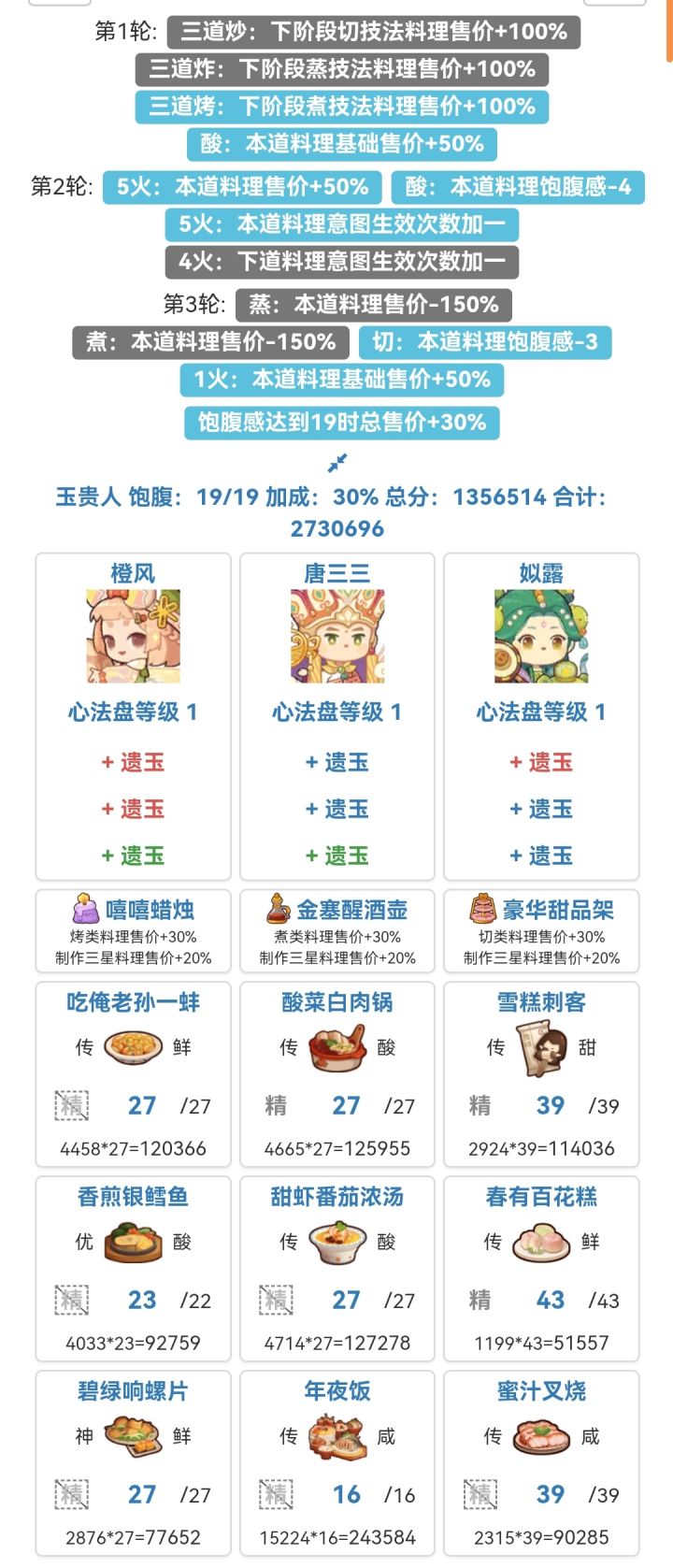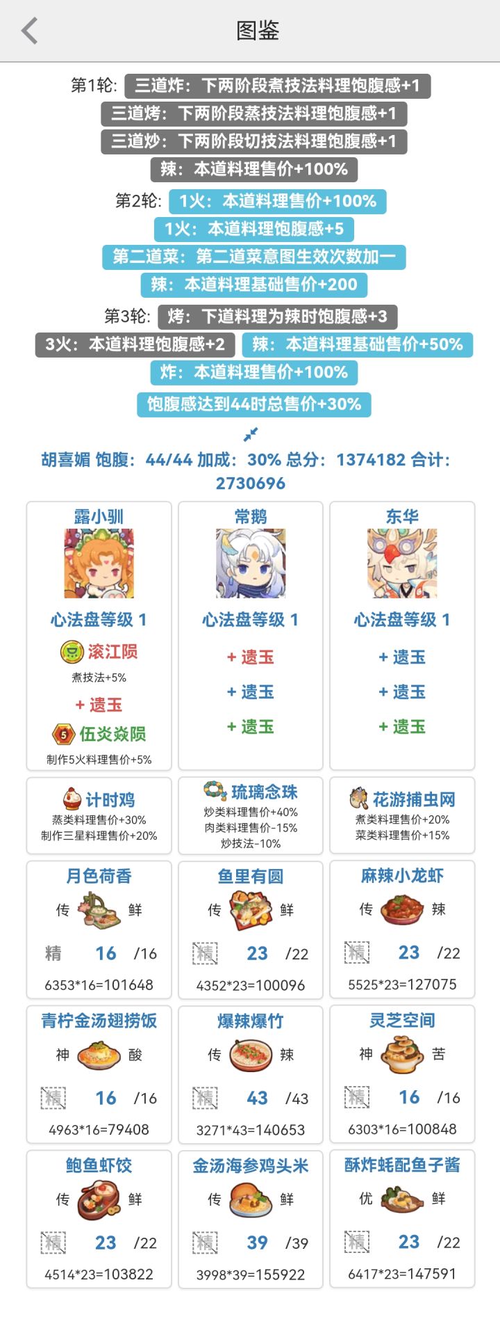 P2 P3是在图鉴里调整过的结果,临时修了达浪(五火菜售价+5%)和提拉姆(四火菜上限+1),又给露小驯上了两块遗玉才过了线