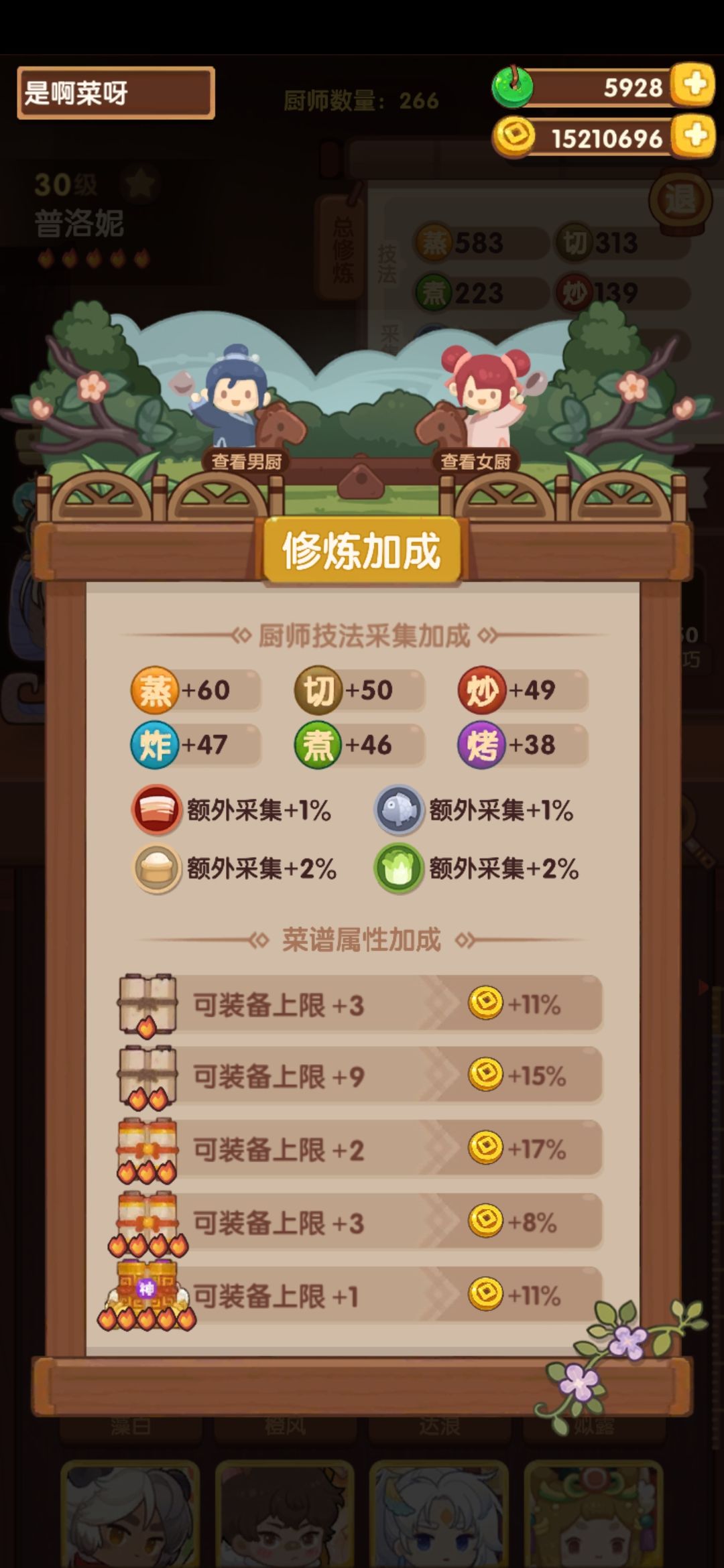 P4为修炼数据,男厨全技法+2,女厨全技法+4