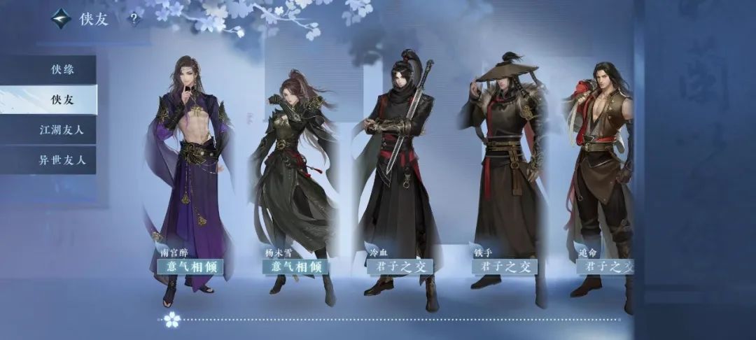 1、侠缘、侠友挂主页:在5月底的1.3.3版本更新后,玩家们可以把侠缘、侠友角色挂上自己的主页,照样是可以挂5个角色,可以自由设置好感角色动作(单人和双人动作)。