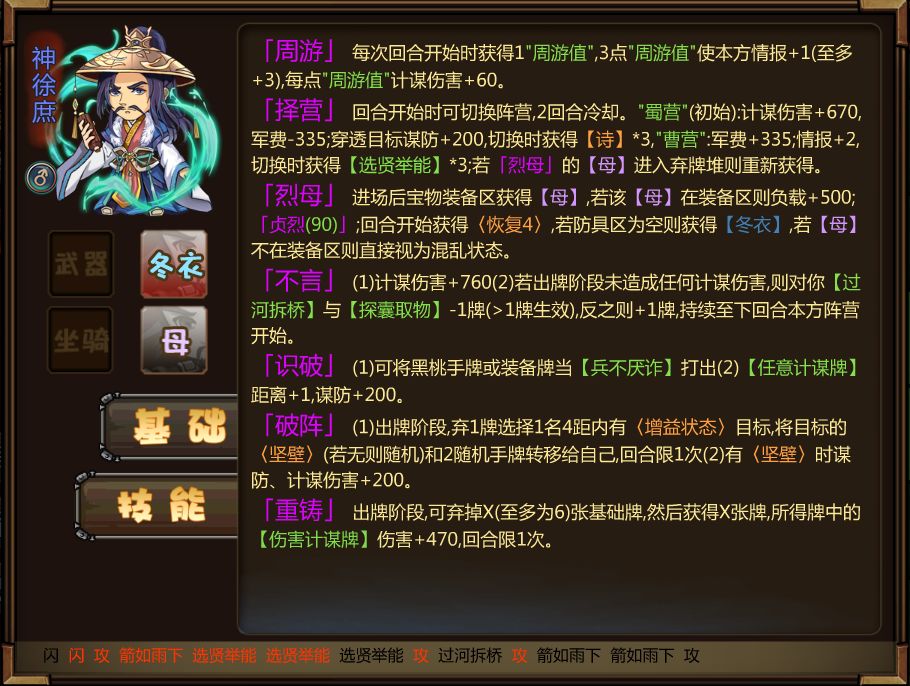 「择营」:回合开始时可切换阵营,2回合冷却。"蜀营"(初始):计谋伤害+670,军费-335;穿透目标谋防+200,切换时获得【诗】*3,"曹营":军费+335;情报+2,切换时获得【选贤举能】*3;若「烈母」的【母】进入弃牌堆则重新获得。
