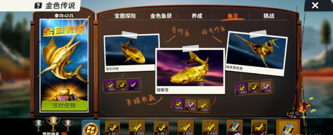 1、奇珍鱼:需要在使用藏宝图的时候钓到一条金色奇珍鱼,奖励是积分、金币、豪华钓箱