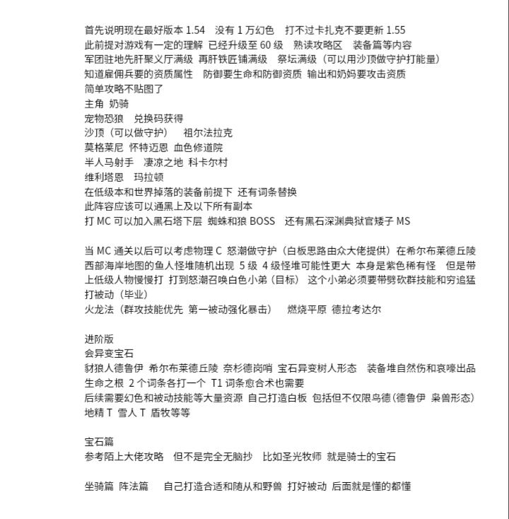 本攻略只适合1.54以及1.62以上的版本,没有新副本,角色试炼难度较低。1.56到1.6版本是公认最难的版本,有新副本,也削弱了好几个技能,输出更难了,角色试炼任务需要一个很难副本掉落的特殊材料。。。所以存够了资源,再升级新版本吧!