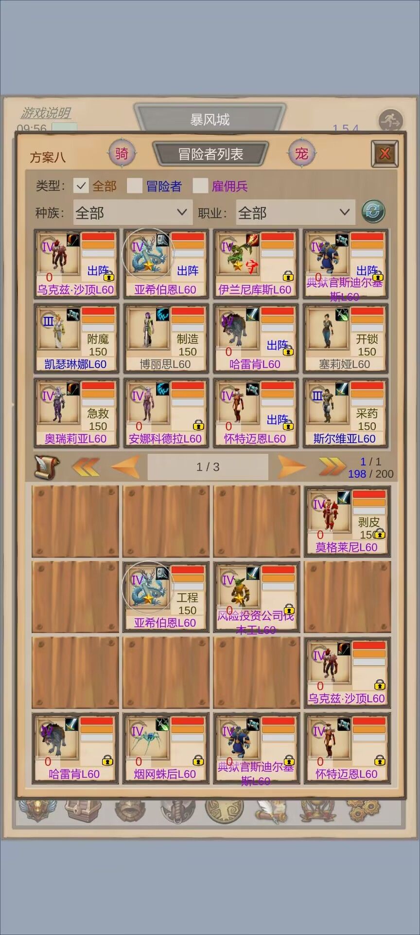 一般是2个冒险者,主角一个,紫色弓箭手一个。刷一套女王的经验套,其余的带需要的佣兵去练级。