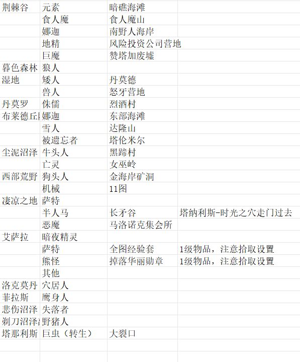 另附一张军团怪物地点的表,标注的是最低等级的怪物在哪个地图。但是很多地图都有至少三种怪物,不一定全部按照这个表格才有这种怪,就看你对地图熟悉程度了。