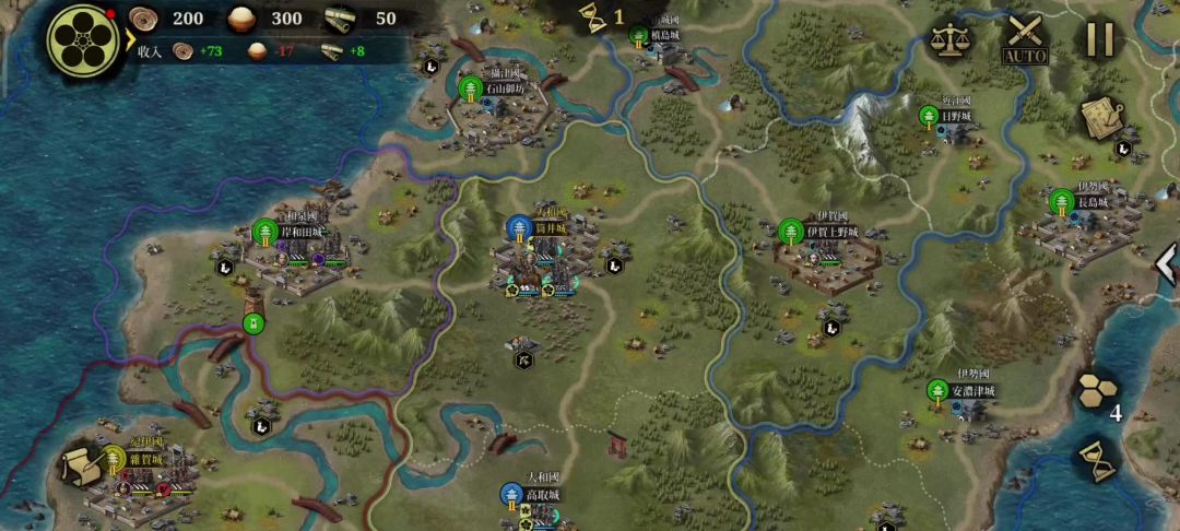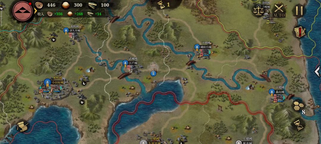 如图,在2回合占领紫织田岸和田城后,紫织田部队整体还是往明智家赶