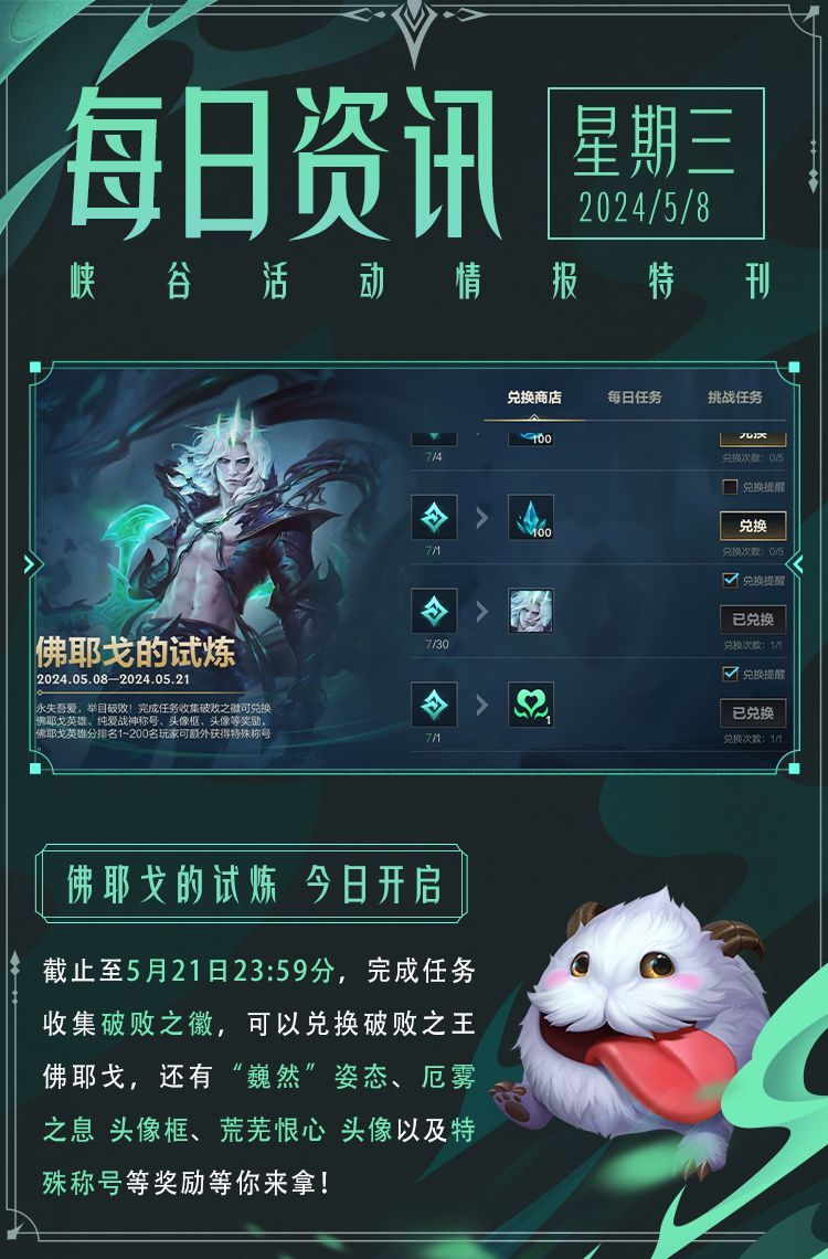 永失吾爱,举目破败!截止至5月21日23:59分,召唤师完成试炼任务,收集破败之徽,即可兑换佛耶戈英雄、“厄雾之息”头像框、“荒芜恨心”头像等奖励。