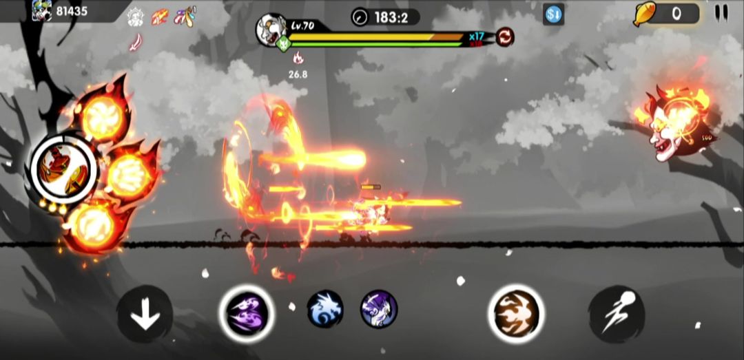 1.使用后在忍者当时位置前方召唤一只火精灵,火精灵会抵挡弹幕攻击同时向前喷射火焰,每次喷射火焰约5秒,喷射完毕等待约4秒后进行下一次喷射,在喷射完4次或者血量耗尽时火精灵消失;