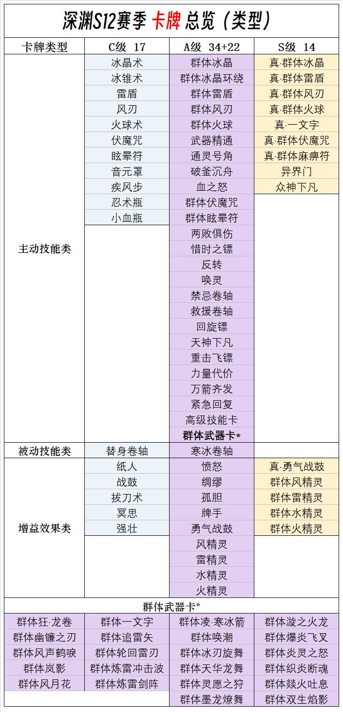 3.群体武器卡中,一文字被单独拎了出来以武器名字命名,并且拥有S级的升级卡牌,其他为武器技能名,本帖为了描述方便,统一归纳在群体武器卡中;