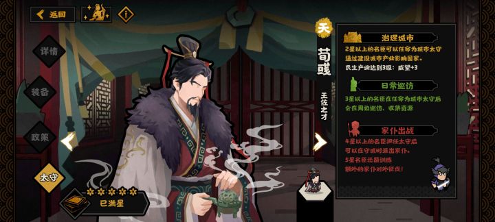 荀彧太守,民生加威望,这个比较好,可以开局抢到会盟,可以弥补贤者没有抢会盟能力的名臣,比如t0的邹衍跟荀攸。