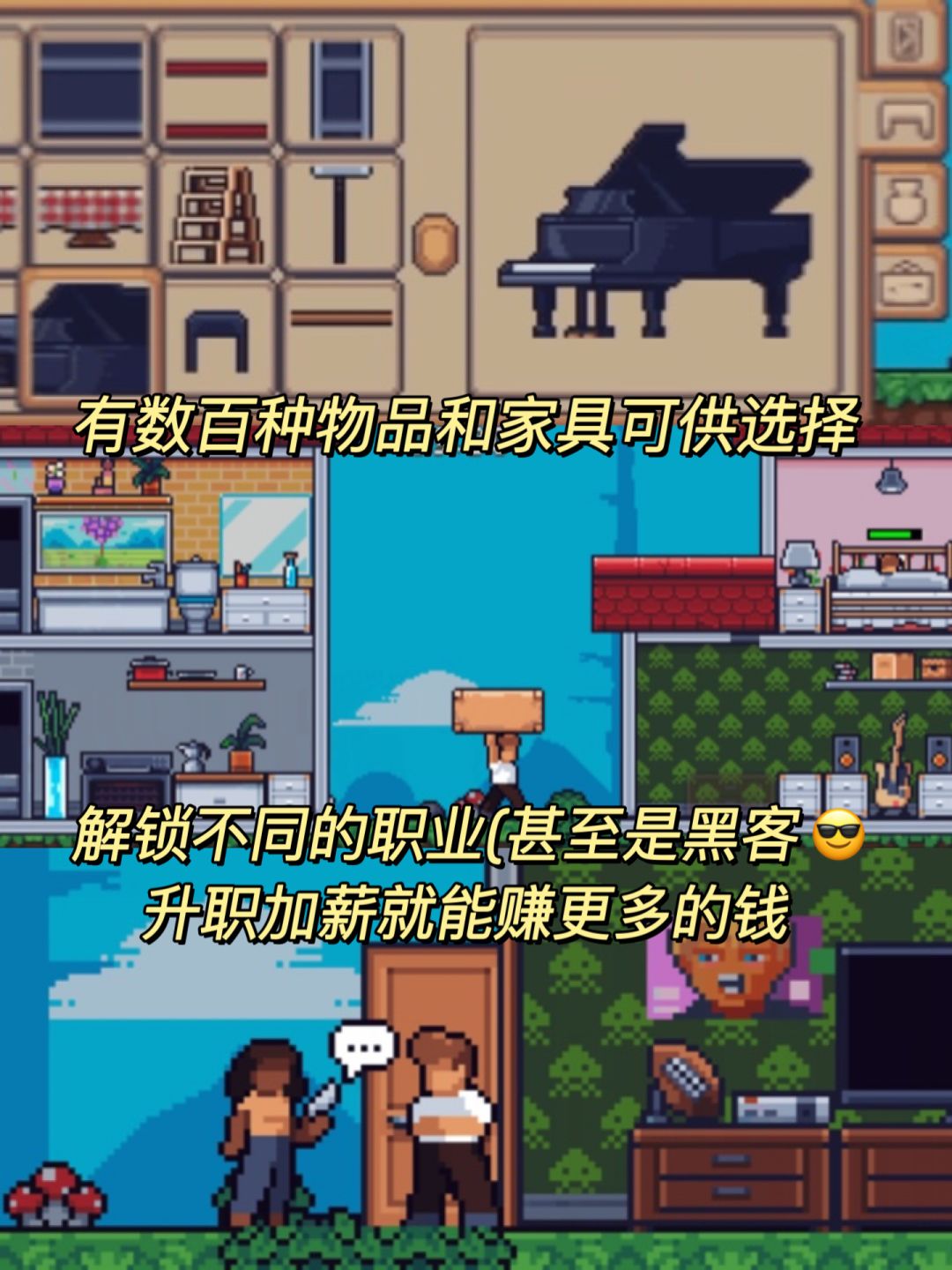 ✨ 你还可以为小人选择不同的职业,成为农民、流光溢彩者、黑客等等。职业上做得越好,用于扩建和定制他们的房子的薪水💰就越高。小人的形象也可以自由定制,选择他们的长相、穿着和个性特征。