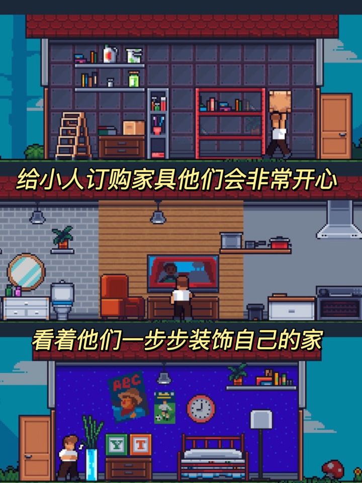 ✨游戏提供了数百种丰富的家具和物品,我们只需要订购自己心仪的家具📦,就会自动送到家门人由小人进行搬运和摆放,看着他们装饰自己的小家🏠