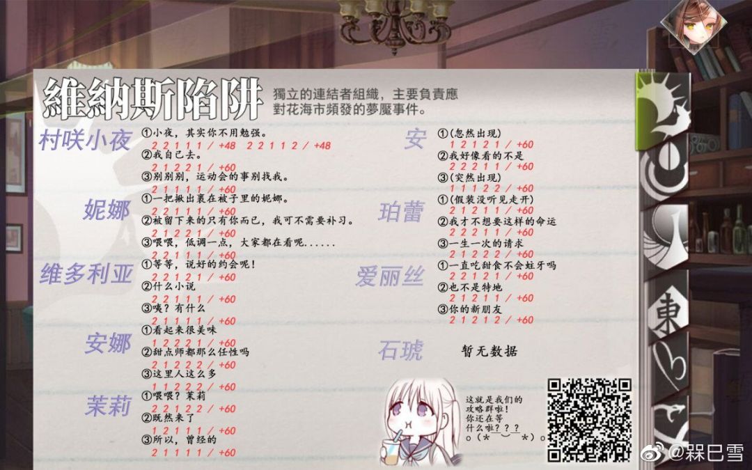 3.有个别角色有两条方向都可以达到最高60好感,已标在了数据后(小夜有一个约会只能加48好感,已经测试了很多遍)