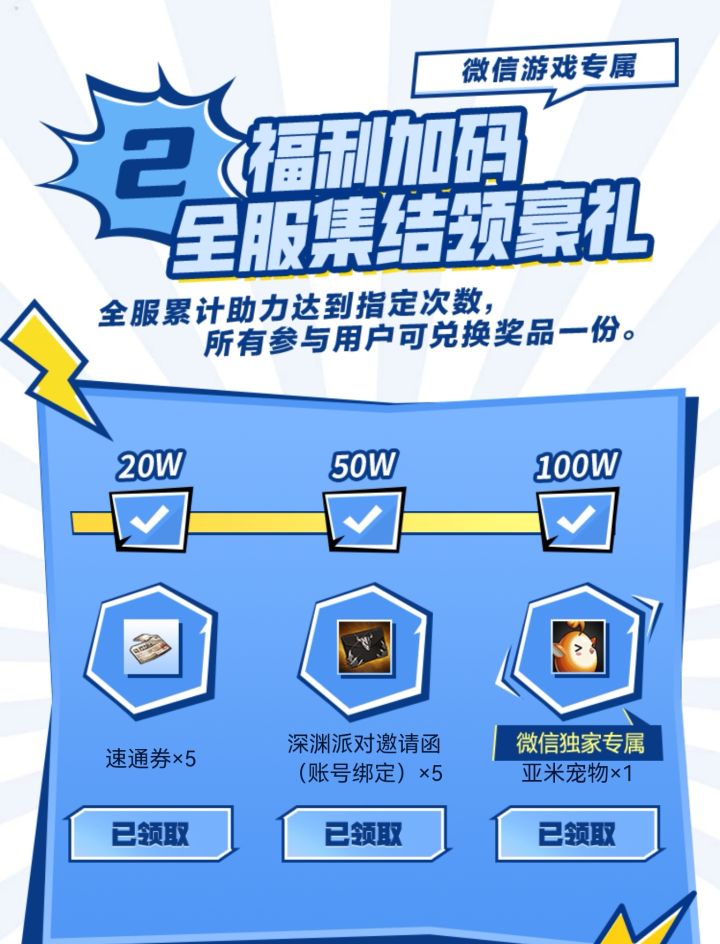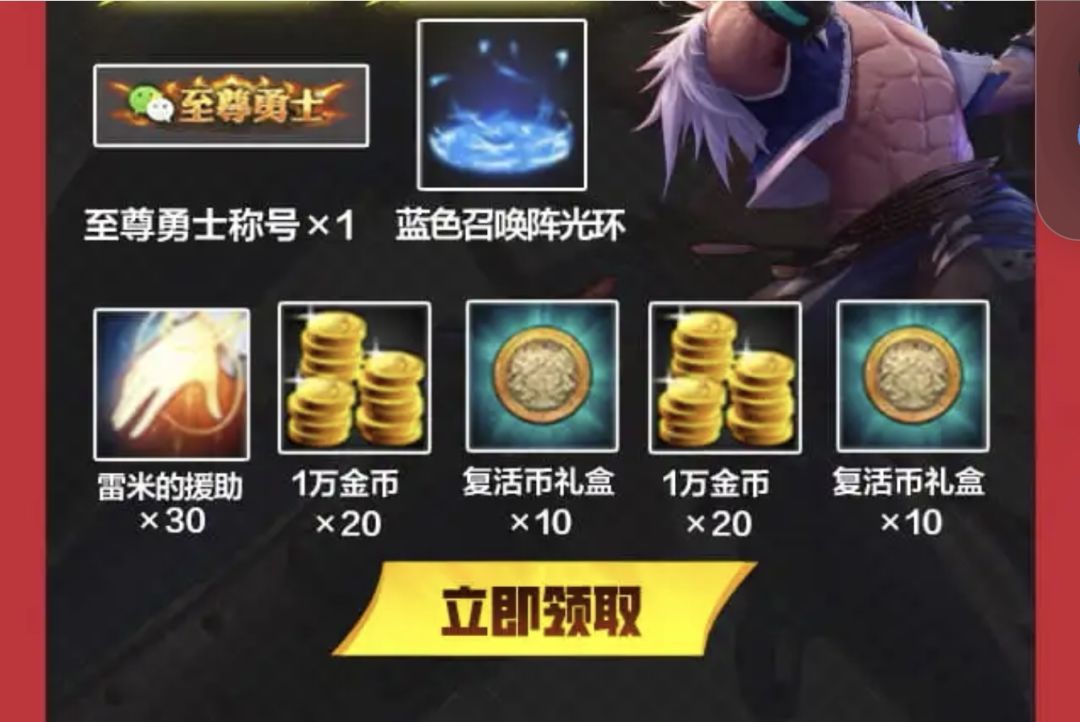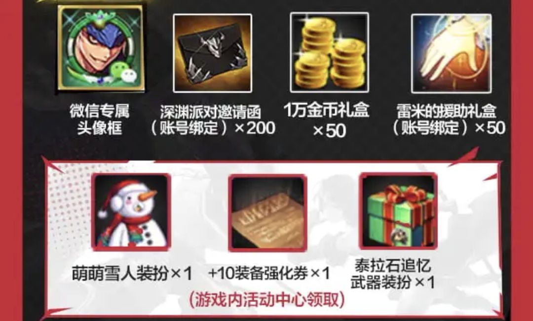 然后就是WX独家预约可获得至尊勇士称号、蓝色召唤阵光环、雷米的援助、1w金币×40、复活币礼盒×20。还有用WX下载游戏还有头像框、深渊派对邀请函(账号绑定)×200、1w礼盒×50、雷米的援助礼盒(账号绑定)×50。游戏开服后,进入游戏内还可以领取萌萌雪人装扮、+10装备强化券×1、泰拉石追忆武器装扮×1。