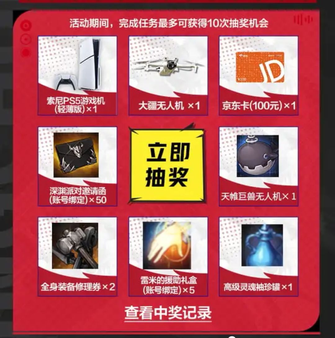 现在预约游戏、每日分享、关注游戏圈、邀请好友可以获得抽奖次数,抽奖可获得索尼的ps5游戏机(0.001%)、大疆无人机(0.002%)、100元JD卡(0.1%)、深渊派对邀请函﹣账号绑定x50(4.897%)、天帷巨兽无人机(15%)、全身装备修理券x2(20%)、雷米的援助礼盒﹣账号绑定x5(30%)、高级灵魂袖珍罐x1(30%)。分享自己做的雪人套还可获得角色金库扩展券。